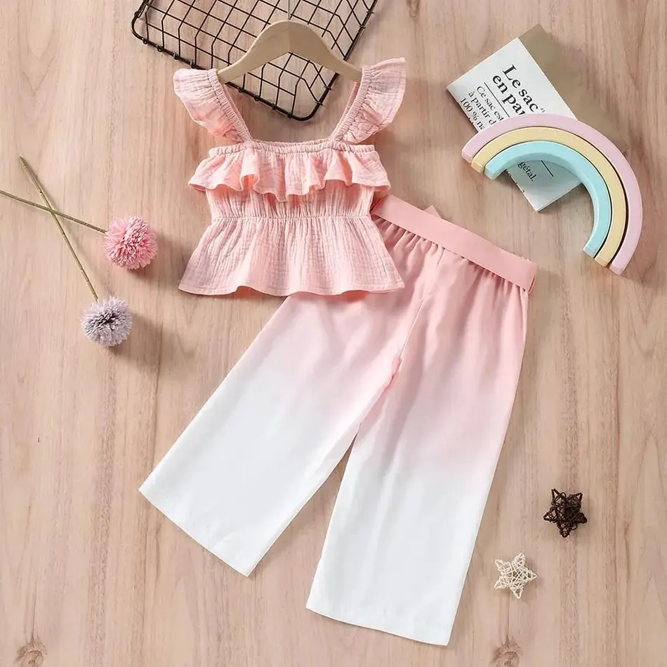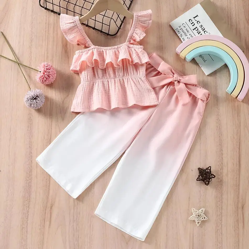 This elegant Toddler Girl Ruffled Peplum Pink Camisole and Gradient Color Belted Pants Set will boost your daughter’s femininity. It has a ruffle features and a bow-tie belt that adds chicness to this outfit.