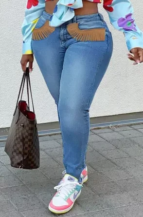 Light blue Fashion Casual Patchwork Basic Plus Size Jeans are ideal in the hip area since they are fitted well enough to feel supportive without being stifling while sitting. She claims that this pair of pants already feels like they’ve been worn before you even put them on.