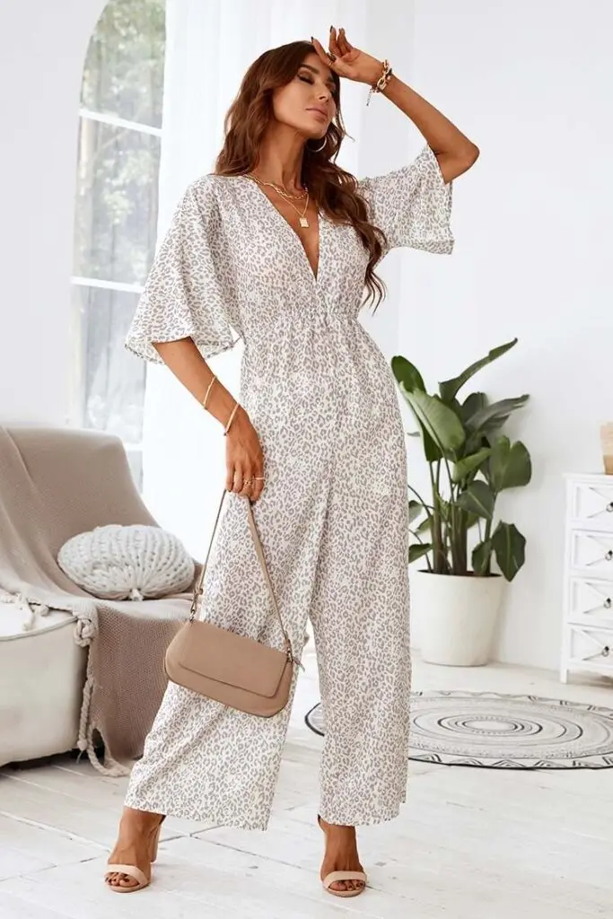 Give your wardrobe a serious update with this jumpsuit. A woven jumpsuit featuring a V-neck, half sleeves and a wide leg silhouette.