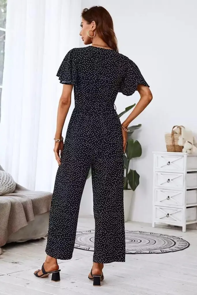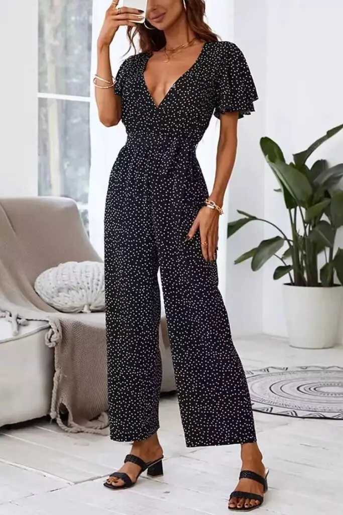 Give your wardrobe a seriously update with this jumpsuit. This Wide Leg Maxi Dots Jumpsuit featuring a V-neckline, shorts sleeves, a dot pattern, and a wide leg silhouette. Perfect for those evening plans you agreed too.