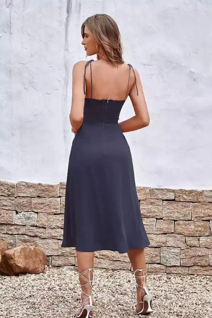 This Aurianna Smocking Tie Thin Straps Dress is very sexy. It features sleeveless and mid length. The thin shoulder straps design can show your beautiful shoulder neck curve.