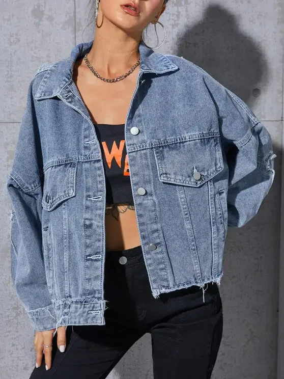 A light-wash denim panel amplifies the patchwork style of this modern denim jacket that will elevate any look in a slouchy fit with frayed-trimmed details and relaxing dropped shoulders.