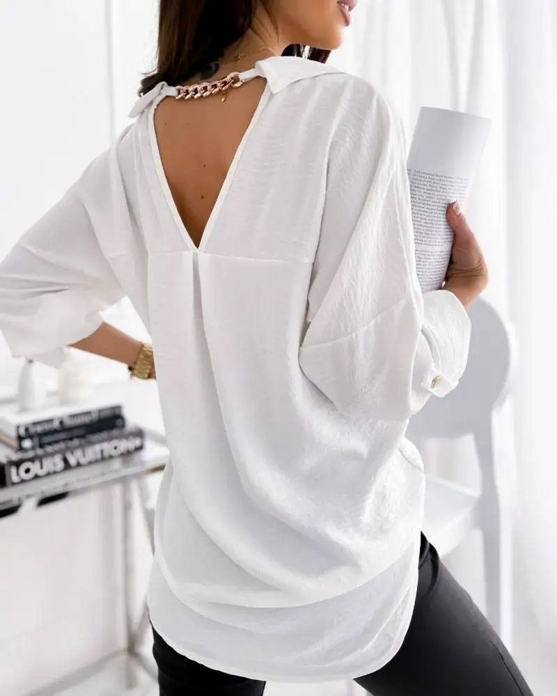 This simple yet chic Chain Decor V-Back Button Down Shirt Dress definitely adds that sophisticated look when you wear it under your sweater.
