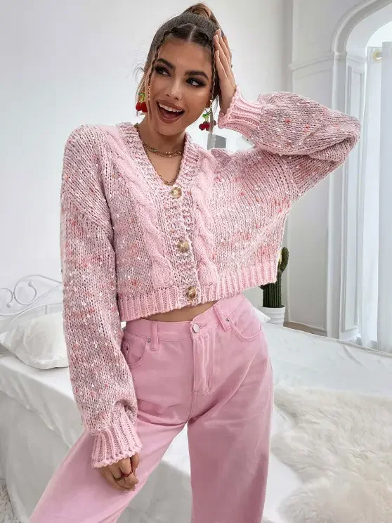 Crafted in polished heathered, textured knit in an on-trend pastel hue, this cropped cardigan is a sleek layer you’ll basically want to live in. A relaxed fit makes it ideal for easy layered looks.