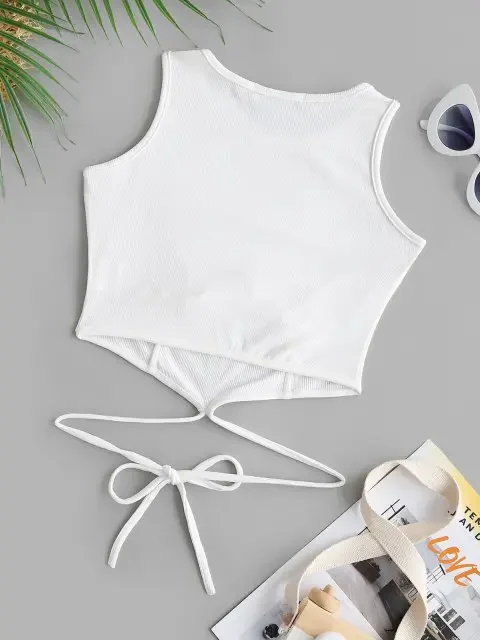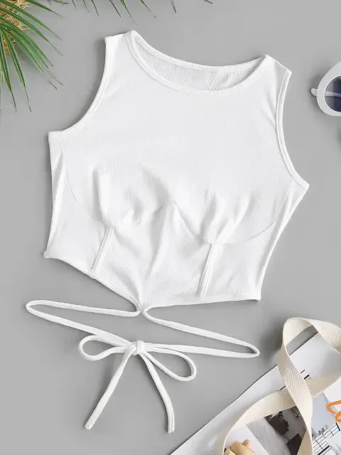 Switch up your off-duty look with this top. It features a rib-knit material, a structured underbust detail, and self-tie straps around the midriff-baring, we love this teamed with a pair of matching hue bottoms and some strappy sandals for an all-white look that everyone will be obsessing over.