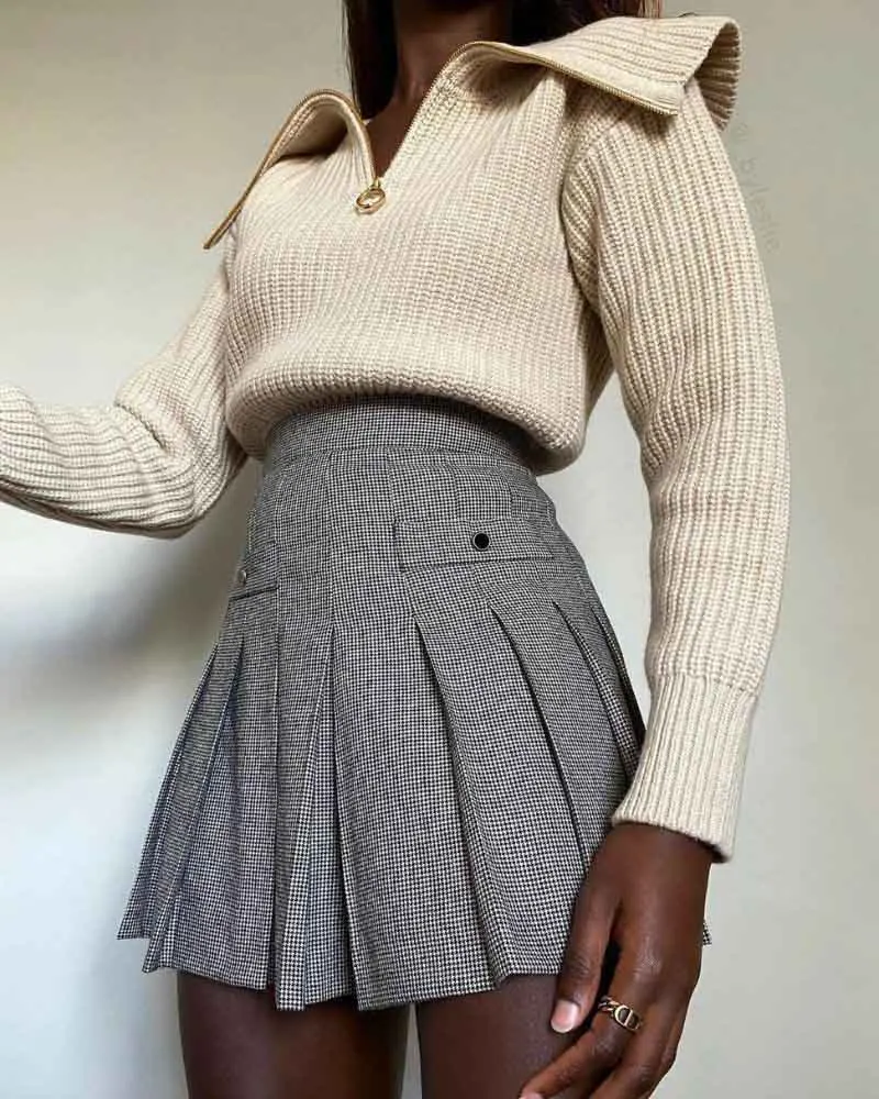 This Houndstooth Print Buttoned Pleated Skirt is a great option for recreating that retro schoolgirl look. You can pair the mini skirt with a sweater, tights, and knee-high boots for the fall and winter, and then transition it into spring with a cropped top and sneakers. This is one of those pieces that will always be in vogue.