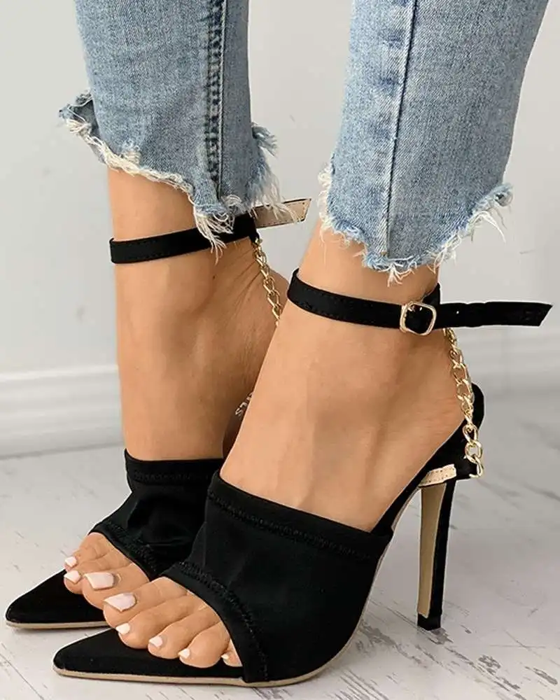 Description: This simple, yet charismatic Chain Strap Pointed Toe Stiletto Heel is a game changer. It has simple details but adds elegance to whatever you’re wearing.