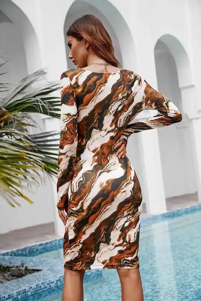 Have all eyes on you in this midi dress featuring an allover marble print, cowl neck, long sleeves, and bodycon silhouette. Complete the look with block heels and your favorite necklace!