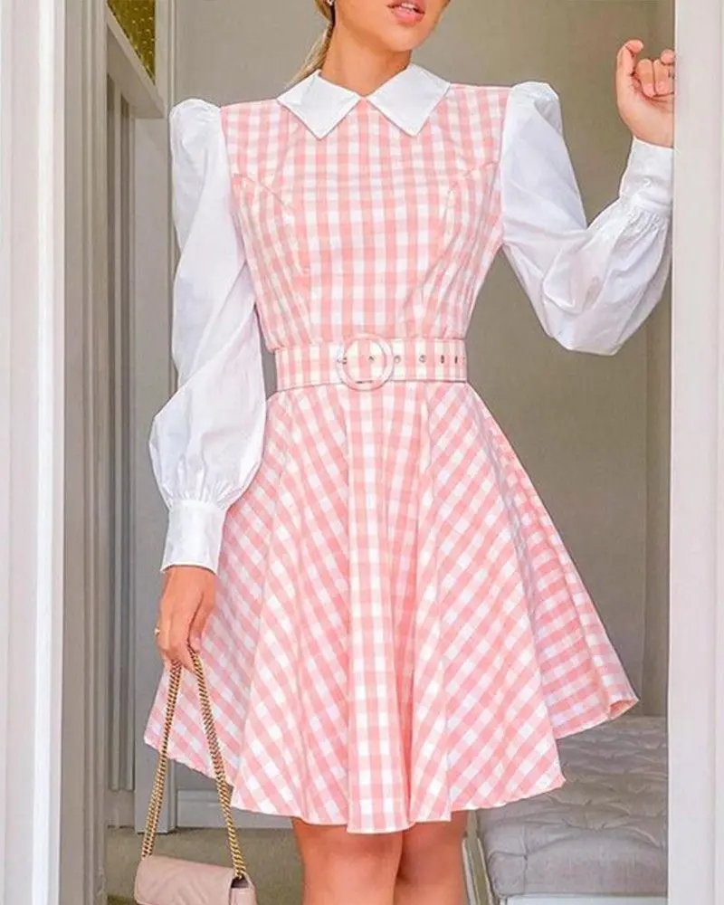 This pink dress is straight up cute and sophisticated. It has a puff sleeves, plaid print, collar, and is an A-line dress. This dress is oozing with elegance.