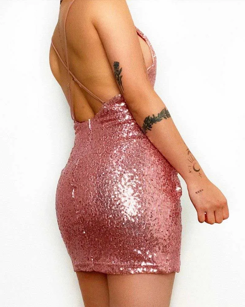 Pink is an already cute color, why not add some glam to it? This dress, will add glam to your looks with its shiny sequins. It has a ruched details, cowl neck, and a spaghetti strap. This dress is both chic and sexy.