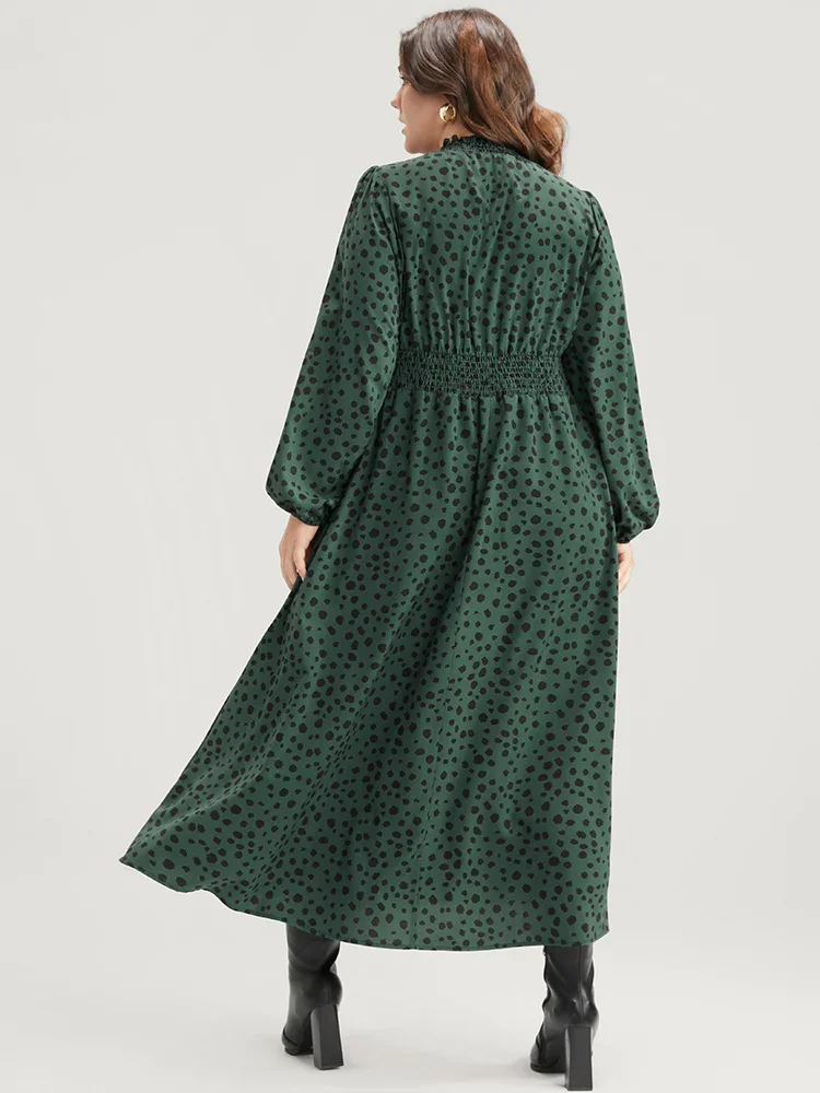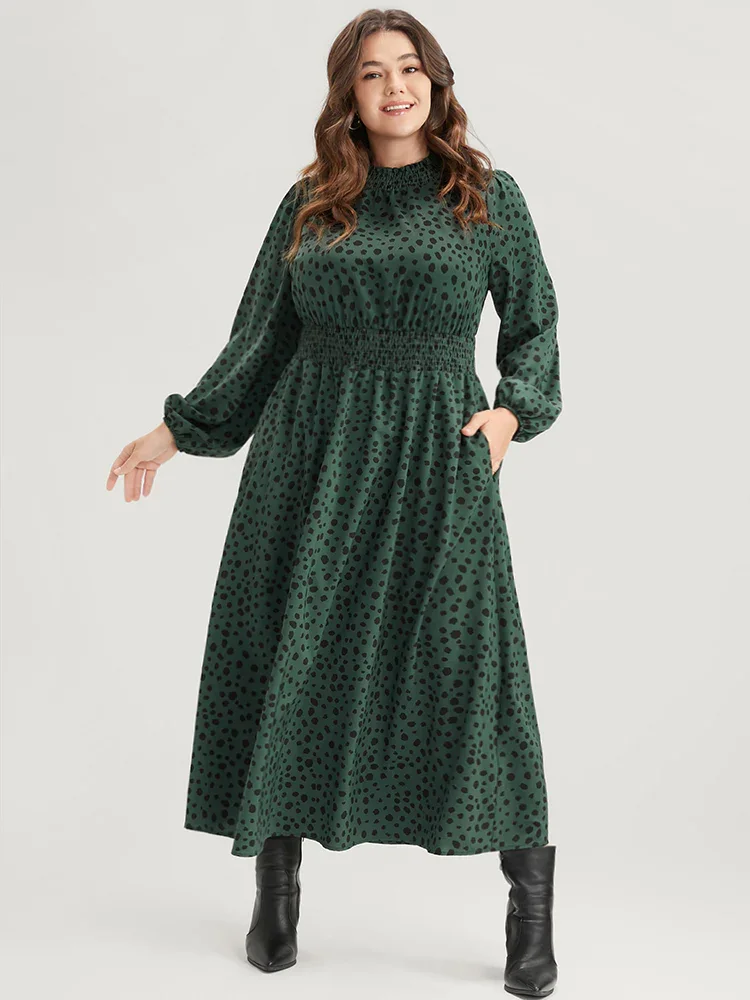This comfy and stylish Polka Dot Mock Neck Pocket Shirred Midi Dress will get you ready for any occasion. It is lavish, stylish, and simple. Pair it with your favorite shoes or boots and get ready to rock this dress.