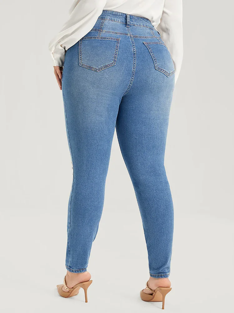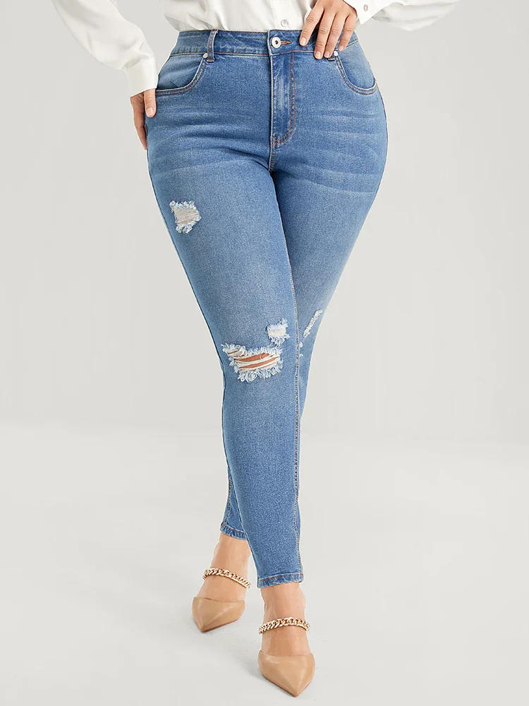 The combination of high-waisted jeans and a sheer top is a great throwback outfit. All of the elements in this picture are both retro and cutting-edge. High heel sandals with straps look great with ripped jeans. A book-shaped purse, like this one, was all the rage among teenage females not so long ago. This ensemble is perfect for running errands in.