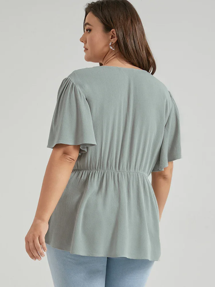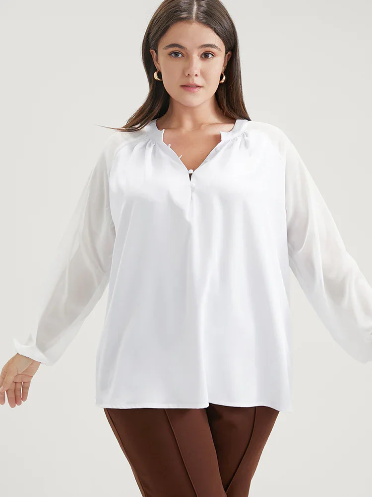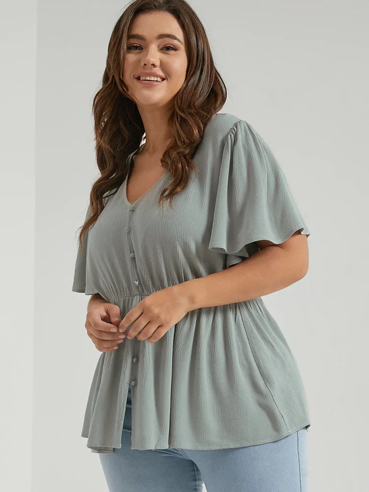 A top or shirt worn by women and children, often under or over another clothing (such as a skirt or pants), that covers the upper body from the neck or shoulders to the waist. A shirt can be worn by either sex, but a blouse is typically associated with women. Both can be considered gender-neutral in a strict sense. Both collared and sleeveless shirts must have a fully buttoned opening, but blouses never do.