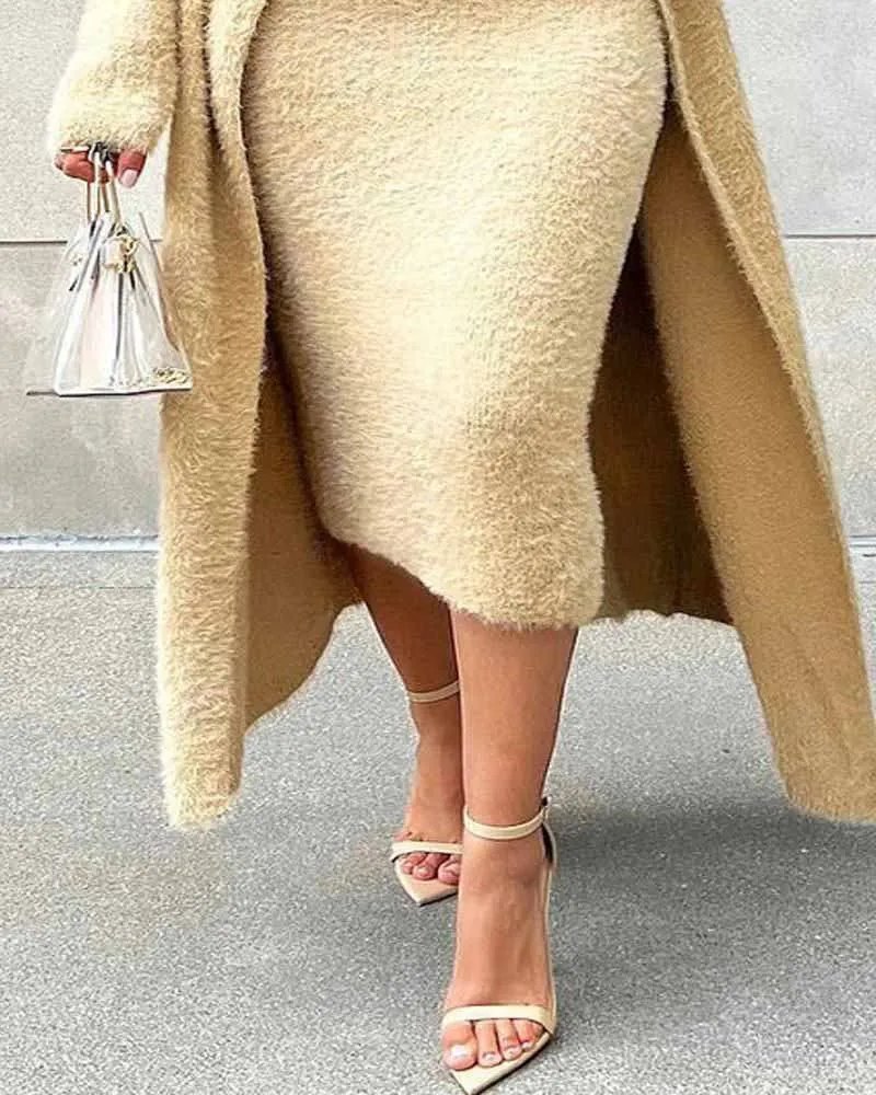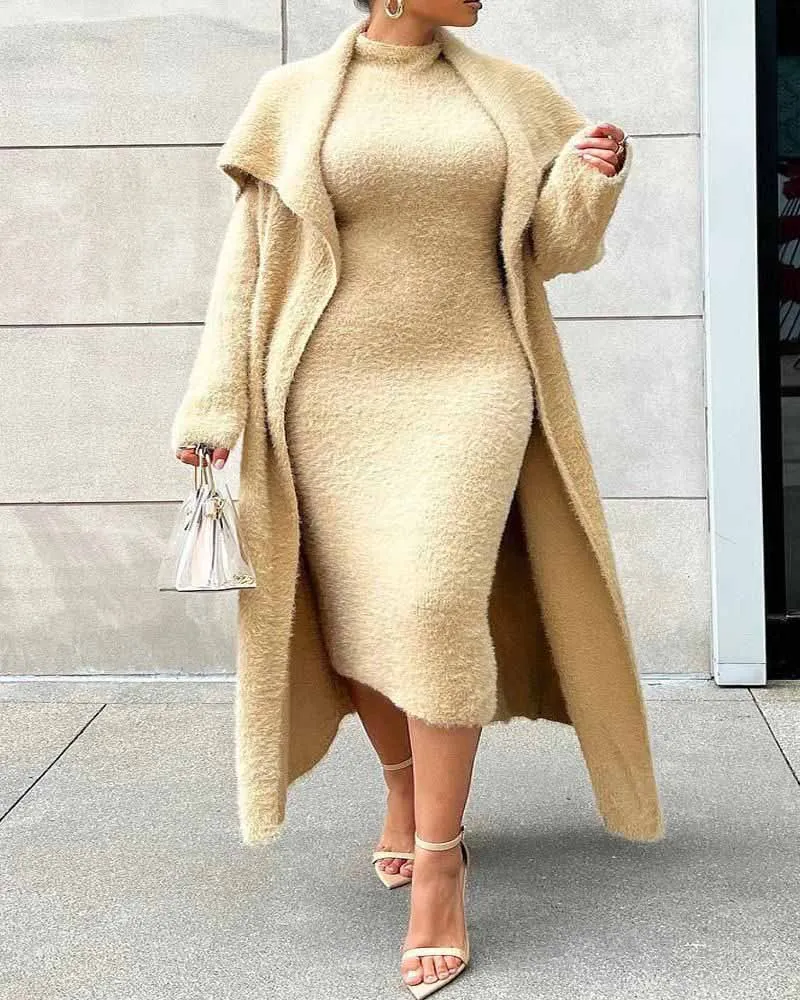 1. Plus Size Fluffy Midi Dress With Longline Coat