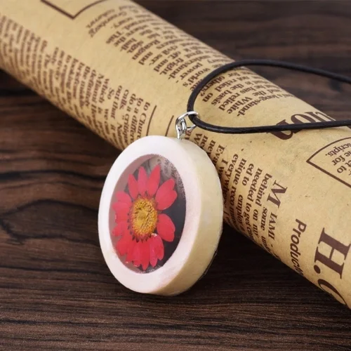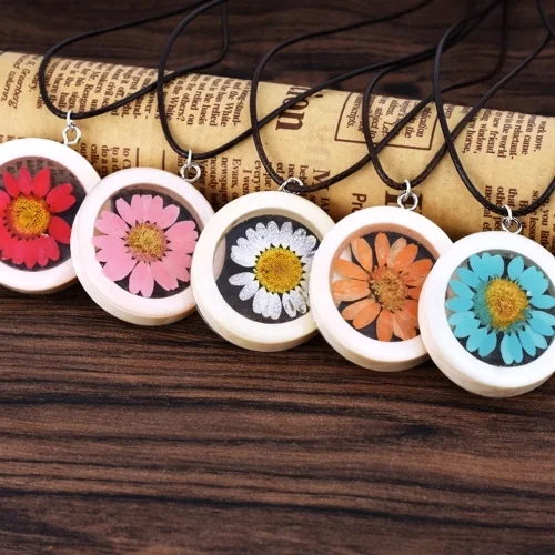 This piece of necklace is unique to embed dried flower in the pendant, catching people’s eyes. Round wood pendant is textured and advanced. You can wear this necklace to travel or party.